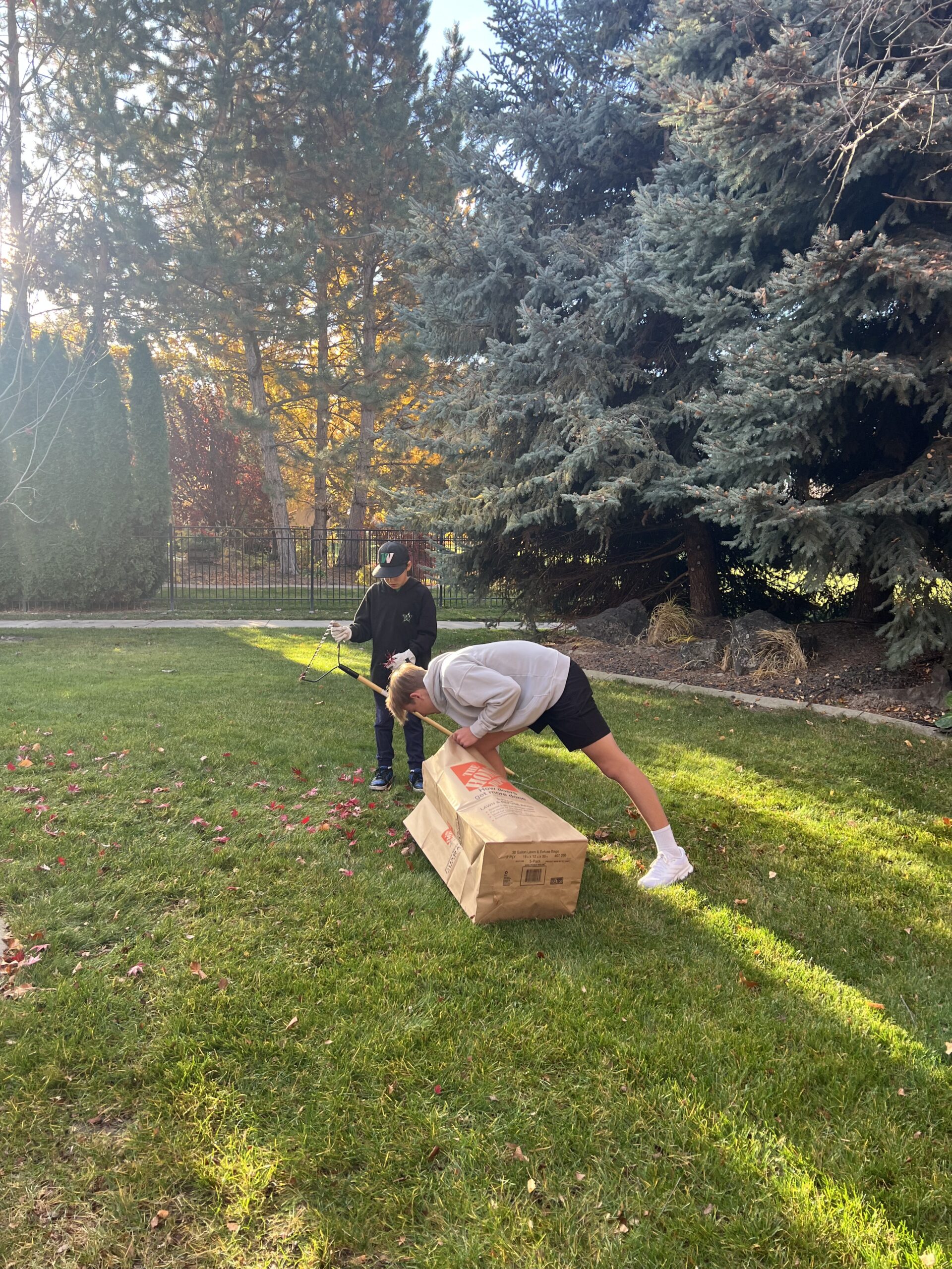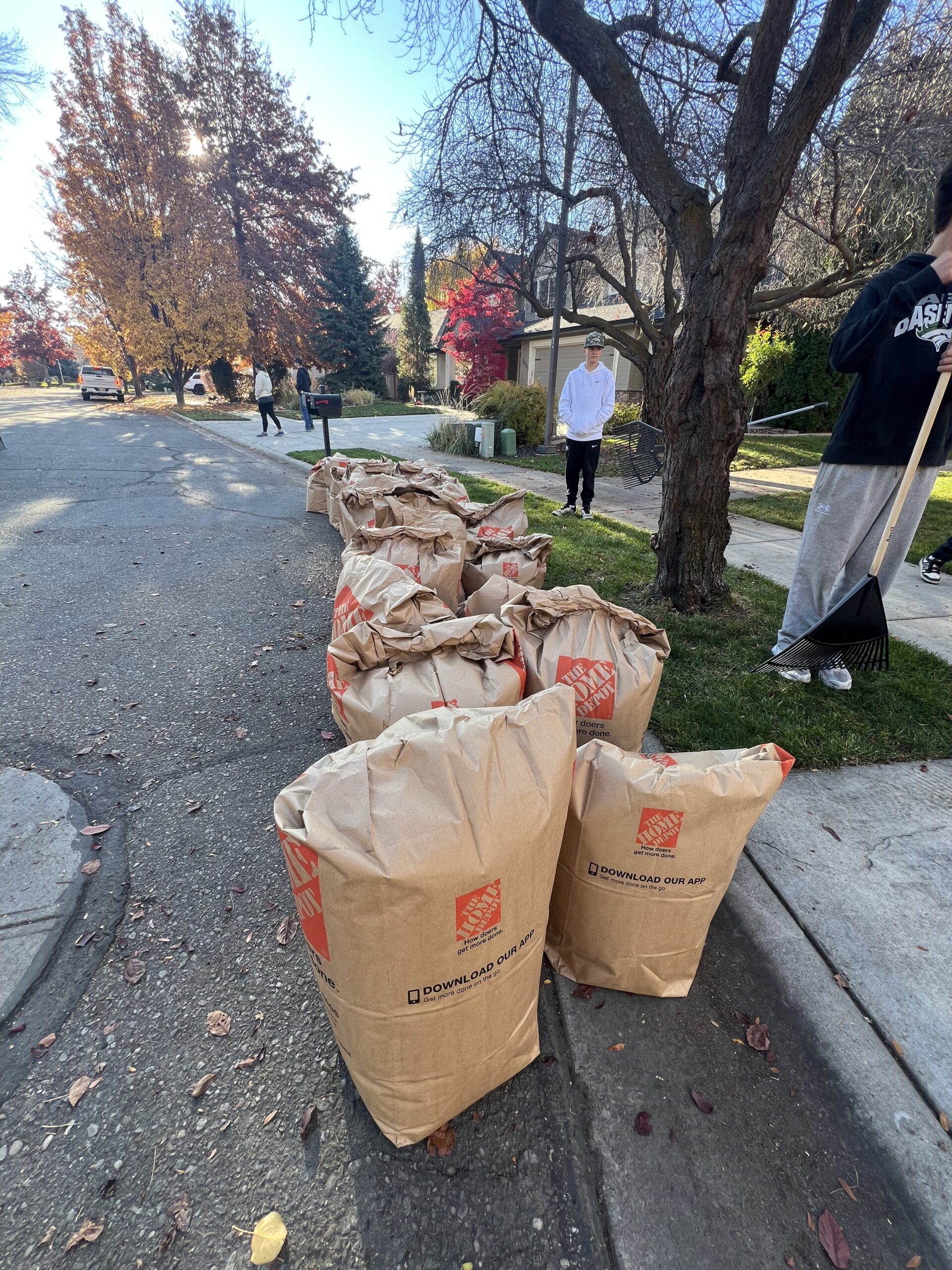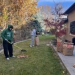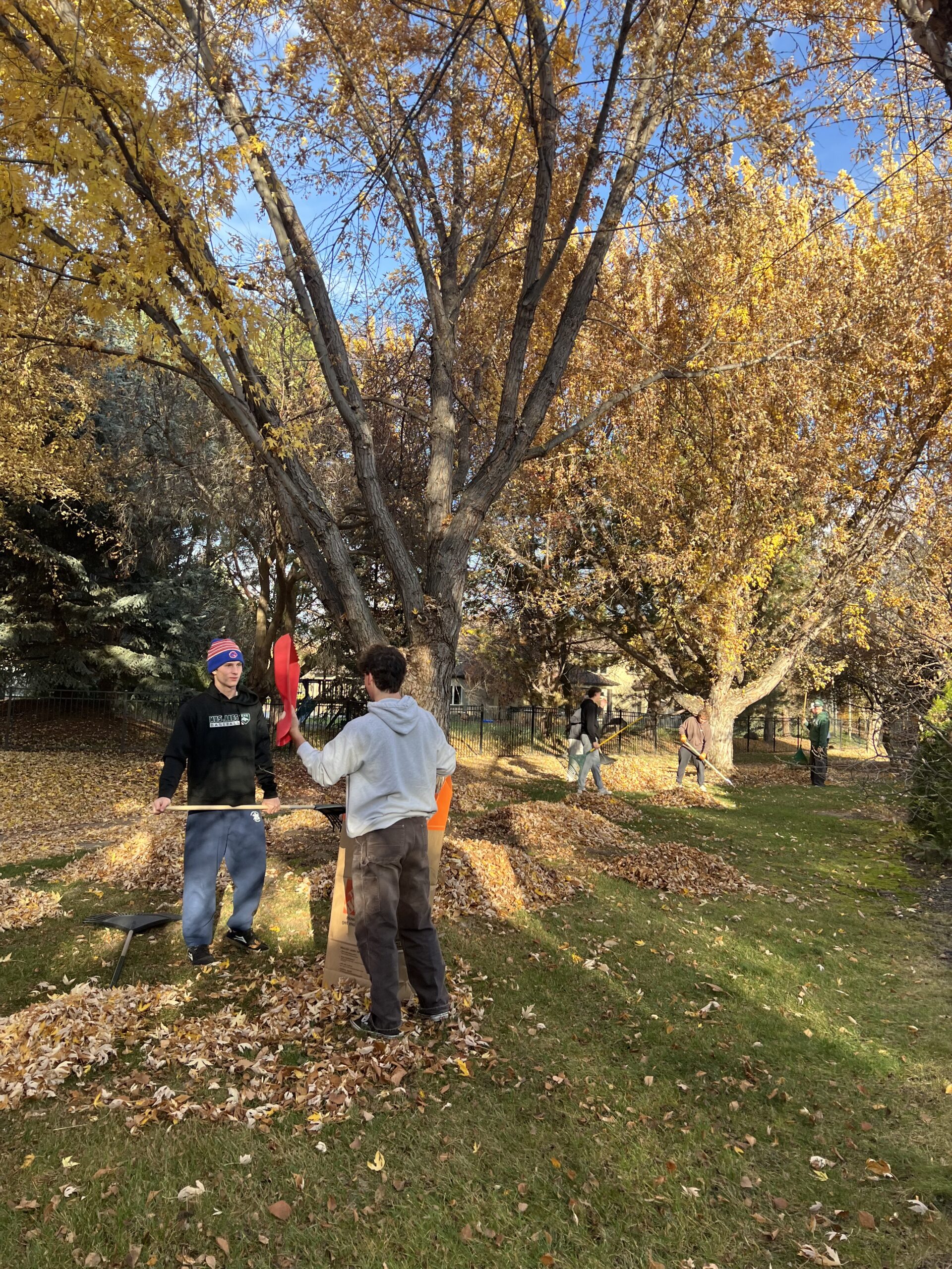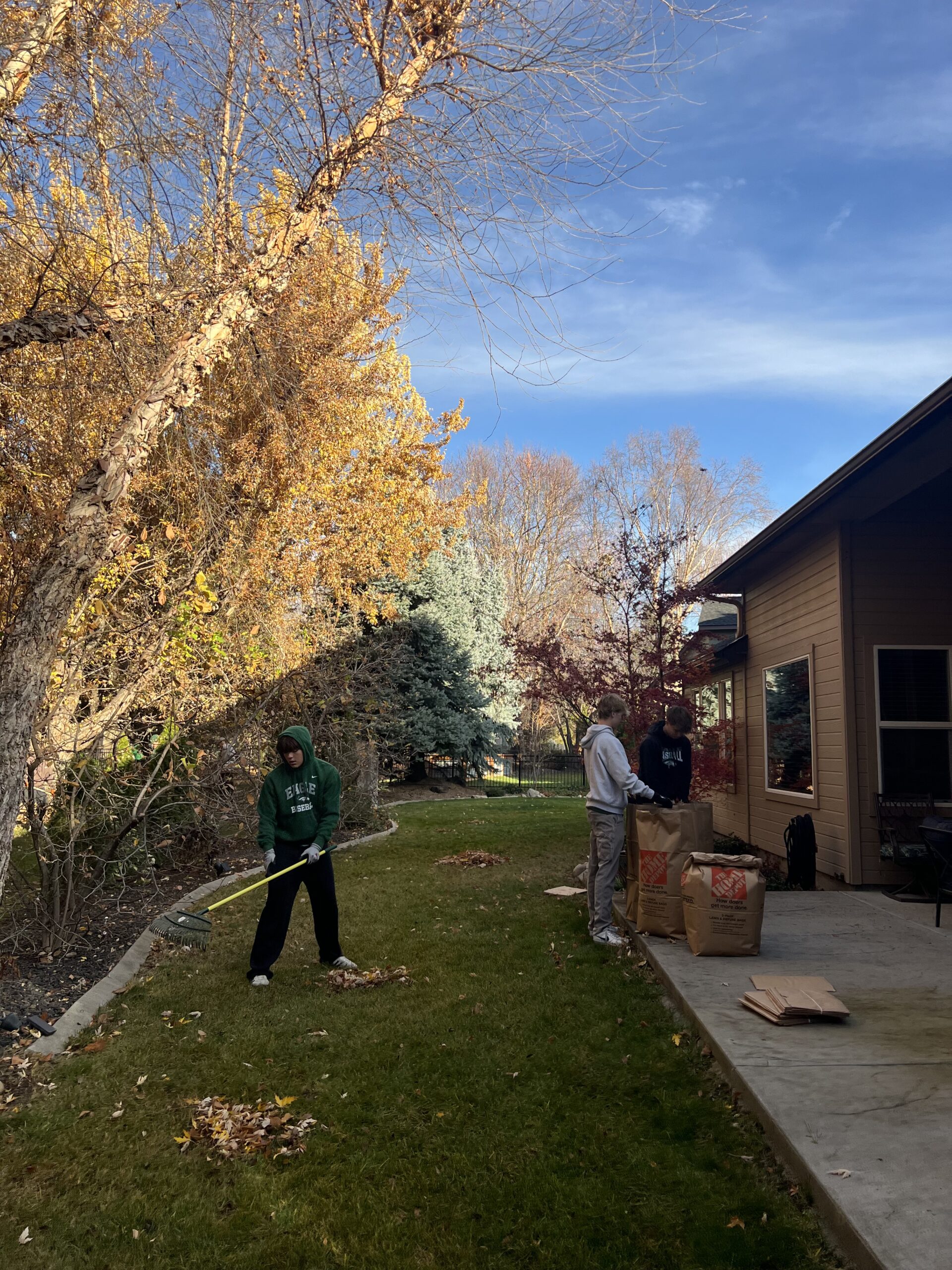 Mustang Baseball helping to rake up the lawns of the elderly, disabled, and veteran members of the Eagle community.